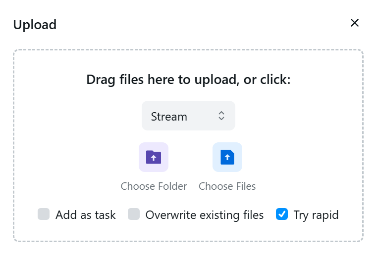 - Try rapid: Upload the file with its checksum information, requires cloud storage support.