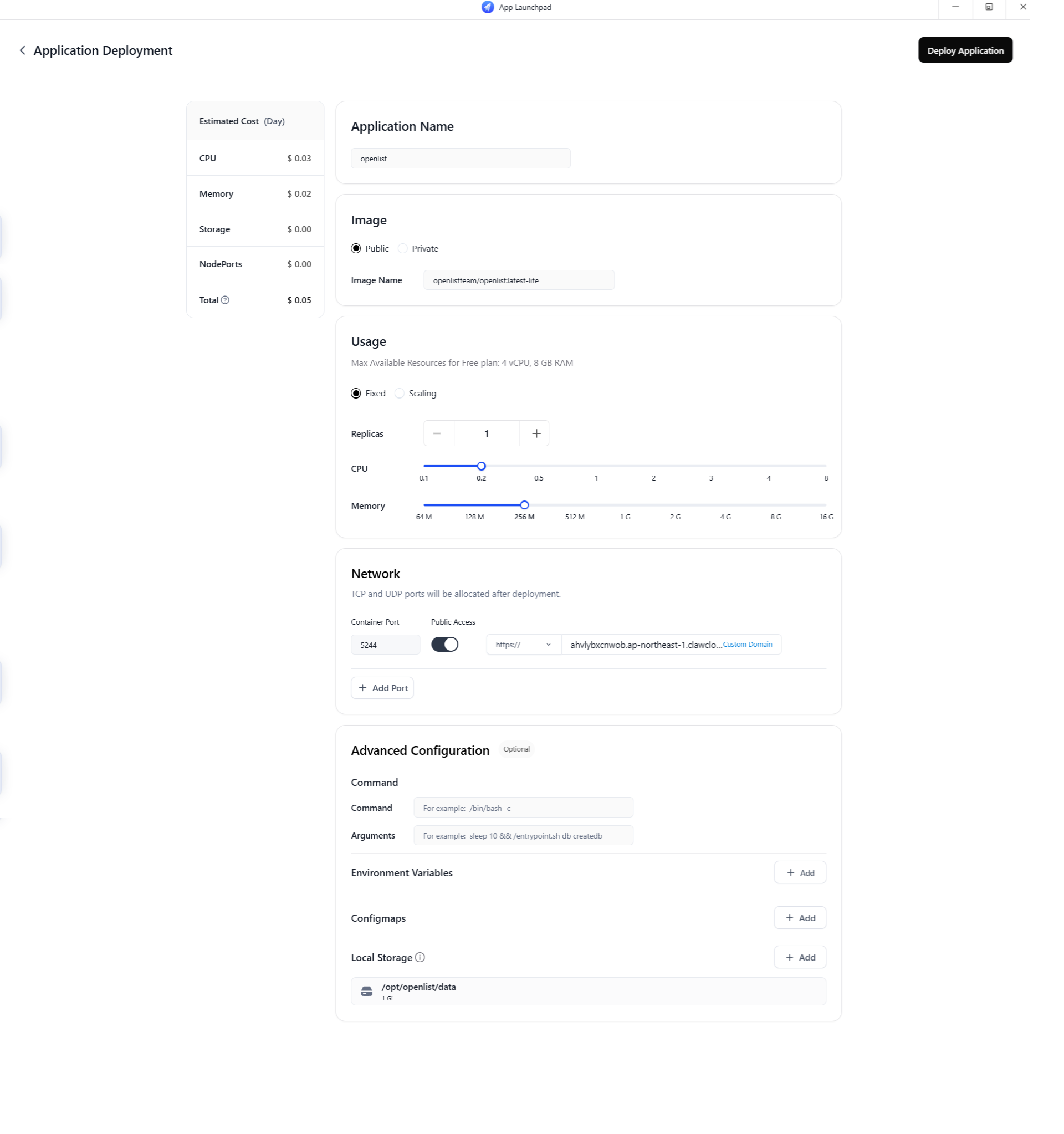 | Image | openlistteam/openlist:latest-lite | Image, please make sure to use the one with lite, otherwise the error Pod ephemeral local storage usage exceeds the total limit of containers 100Mi. may occur |