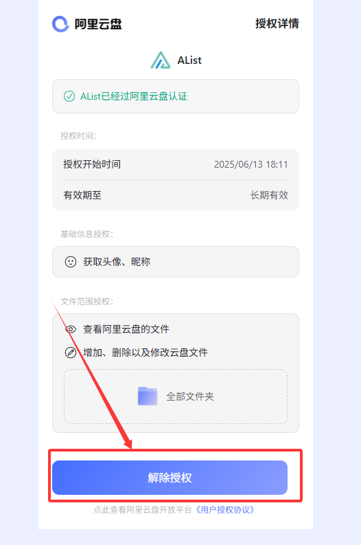 - 在 “已授权的云服务” 中找到 Alist,点击进入后点击 “解除授权”