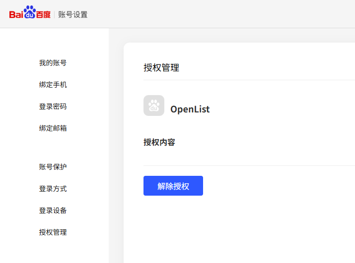 - Baidu Netdisk App - My - Settings - Account Management - Authorization Management - Alist - Revoke Authorization