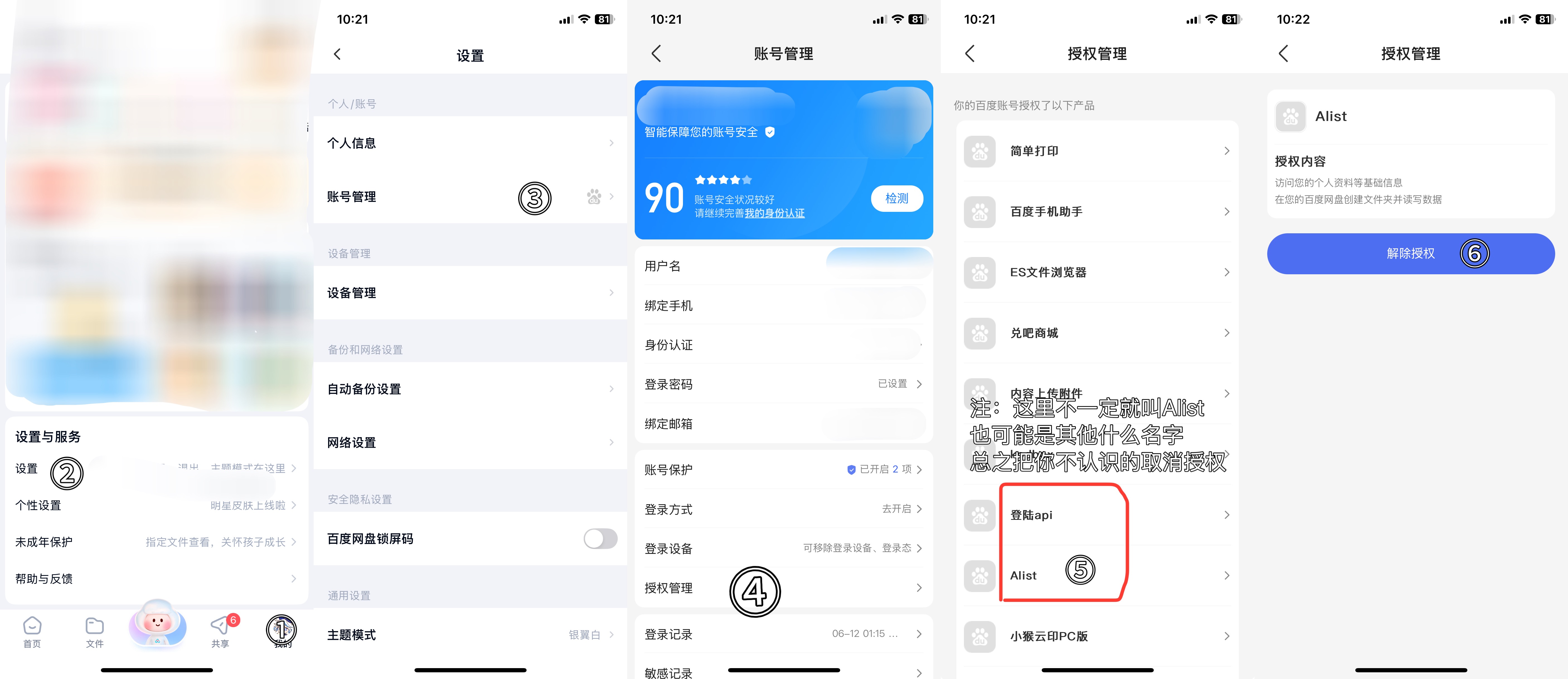 - 百度网盘App - 我的 - 设置 - 帐号管理 - 授权管理 - Alist - 解除授权